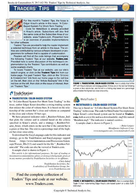 For this month’s Traders’ Tips, the focus is Edgar Kraut’s article in this issue, “A Color-Based System For Short-Term Trading.”