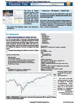 The Traders’ Tips section is provided to help readers implement a selected technique from an article in this issue or another recent issue. The entries here are contributed by software developers or programmers for software that is capable of customization.