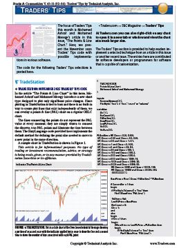 The Traders’ Tips section is provided to help readers implement a selected technique from an article in this issue or another recent issue. The entries here are contributed by software developers or programmers for software that is capable of customization.