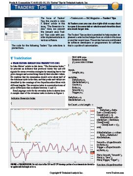 The Traders’ Tips section is provided to help readers implement a selected technique from an article in this issue or another recent issue. The entries here are contributed by software developers or programmers for software that is capable of customization.